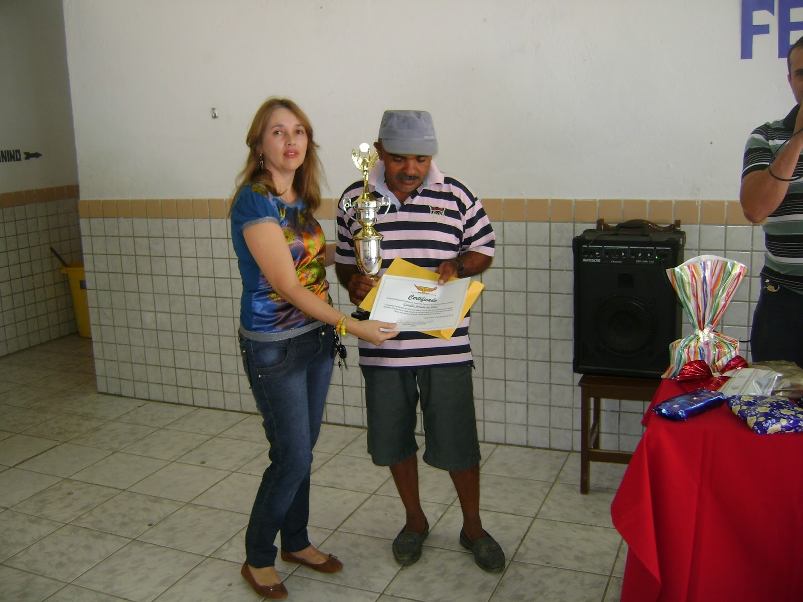 | Professora Sheila entrega prêmio ao Senhor Geraldo |